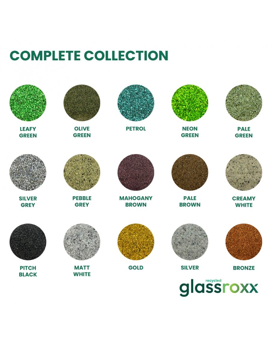 GlassRoxx is a glass granulate made entirely from recycled glass from the recycling bin and coloured with organic, sustainable water-based pigments. It is a fully circular product that works very well with Jesmonite and produces fantastic effects. GlassRoxx is completely safe to use. It is dust-free, harmless to health and not sharp.