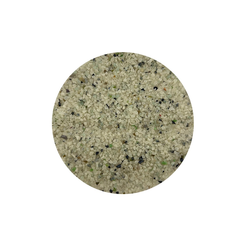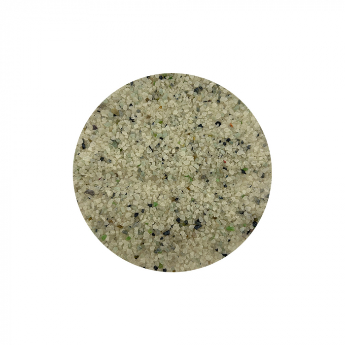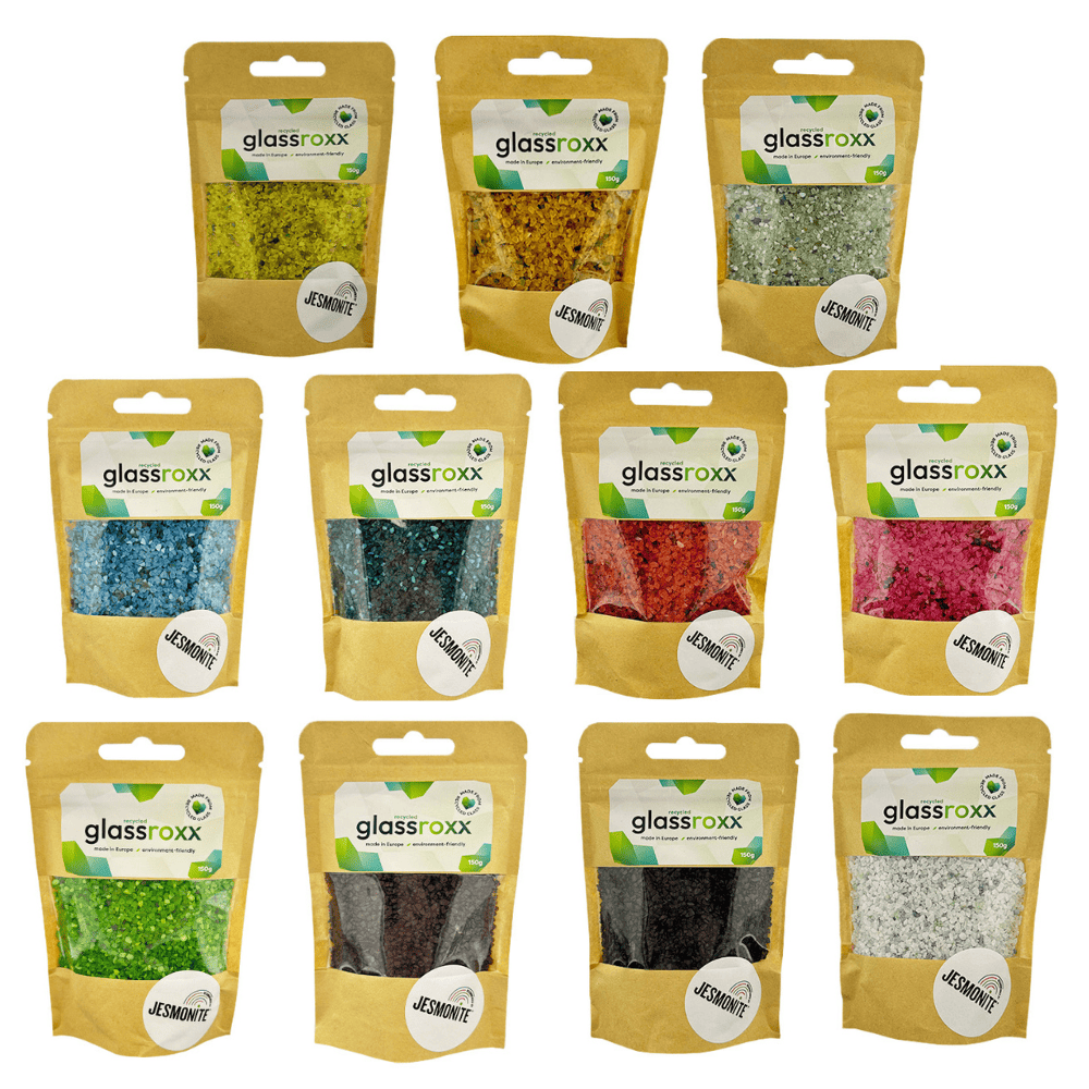GlassRoxx is a glass granulate made entirely from recycled glass from the recycling bin and coloured with organic, sustainable water-based pigments. It is a fully circular product that works very well with Jesmonite and produces fantastic effects. GlassRoxx is completely safe to use. It is dust-free, harmless to health and not sharp.